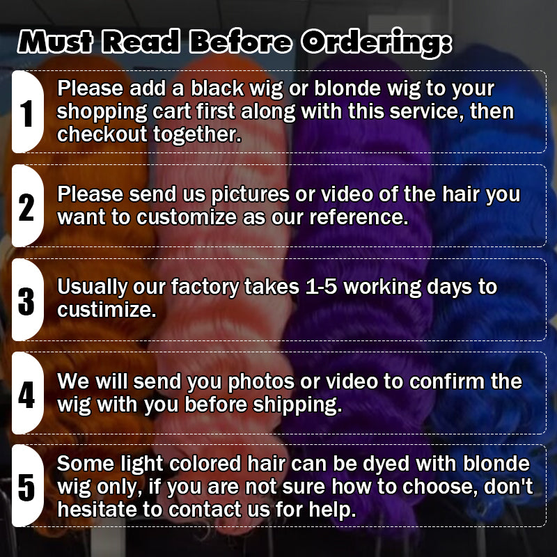- Please add a black wig or blonde wig to your shopping cart first along with this service, then checkout together. Single buy won't be shipped.